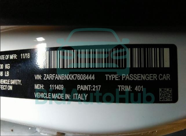 Each lot presented on our website includes comprehensive information tied to the VIN code. This allows users to cross-check vehicle data, verify the history of ownership, and confirm accident or insurance records. The ALFA ROMEO GIULIA 2019 - VIN: ZARFANBNXK7608444 corresponds to a car that was listed through one of the large insurance auctions in USA, which guarantees traceability and transparency of the information.
