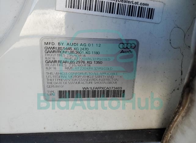 Each lot presented on our website includes comprehensive information tied to the VIN code. This allows users to cross-check vehicle data, verify the history of ownership, and confirm accident or insurance records. The AUDI Q5 2012 - VIN: WA1LFAFPXCA073469 corresponds to a car that was listed through one of the large insurance auctions in USA, which guarantees traceability and transparency of the information.