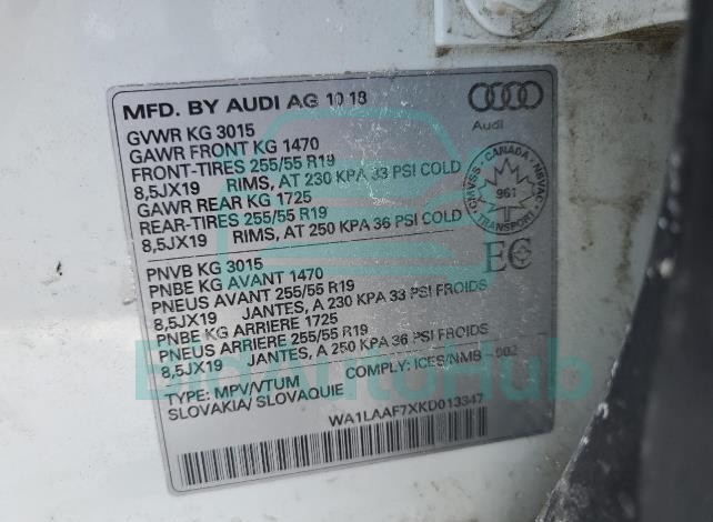 Each lot presented on our website includes comprehensive information tied to the VIN code. This allows users to cross-check vehicle data, verify the history of ownership, and confirm accident or insurance records. The AUDI Q7 2019 - VIN: WA1LAAF7XKD013347 corresponds to a car that was listed through one of the large insurance auctions in USA, which guarantees traceability and transparency of the information.