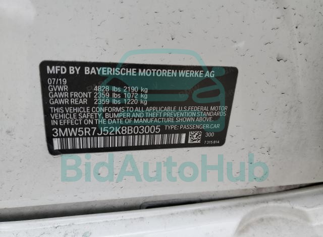 The BMW 3 SERIES 2019 - VIN: 3MW5R7J52K8B03005 is equipped with a 2.0L 4 engine. This power unit is known for its efficiency and reliability, and it is part of modern generation of engines designed to balance performance with fuel economy. According to the auction data, the vehicle was registered with only of mileage at the time of sale.