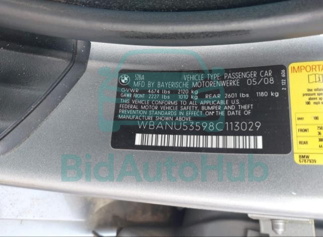 The BMW 5 SERIES 2008 - VIN: WBANU53598C113029 is equipped with a 3.0l i-6 dohc, vvt, 230hp engine. This power unit is known for its efficiency and reliability, and it is part of modern generation of engines designed to balance performance with fuel economy. According to the auction data, the vehicle was registered with only 0 miles of mileage at the time of sale.