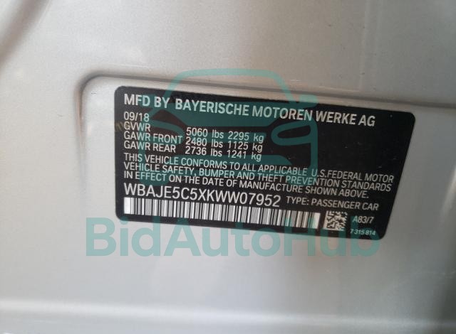 For a full understanding of the condition of this BMW 5 SERIES 2019 - VIN: WBAJE5C5XKWW07952, it is strongly advised to analyze all available materials β both technical specifications and auction photographs. Such analysis provides the most objective picture of the carβs history, its advantages, and its potential defects.