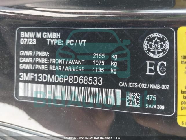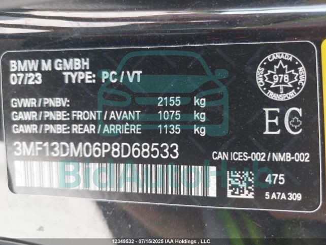 This BMW M2 2023 - VIN: 3MF13DM06P8D68533 was originally purchased at one of the major insurance auctions in the United States or Canada. The vehicle history is tied directly to its VIN code, which makes it possible to track the origin, condition, and circumstances of the sale. The photographs provided represent the actual state of the car at the moment of auction and serve as an important visual record of its technical and cosmetic condition.