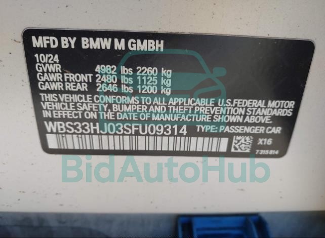 This BMW M3 2025 - VIN: WBS33HJ03SFU09314 was originally purchased at one of the major insurance auctions in the United States or Canada. The vehicle history is tied directly to its VIN code, which makes it possible to track the origin, condition, and circumstances of the sale. The photographs provided represent the actual state of the car at the moment of auction and serve as an important visual record of its technical and cosmetic condition.