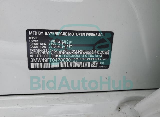 This BMW M340I 2023 - VIN: 3MW49FF04P8C90127 was originally purchased at one of the major insurance auctions in the United States or Canada. The vehicle history is tied directly to its VIN code, which makes it possible to track the origin, condition, and circumstances of the sale. The photographs provided represent the actual state of the car at the moment of auction and serve as an important visual record of its technical and cosmetic condition.