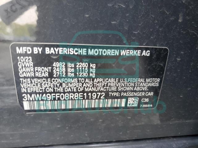 This BMW M340I 2024 - VIN: 3MW49FF08R8E11972 was originally purchased at one of the major insurance auctions in the United States or Canada. The vehicle history is tied directly to its VIN code, which makes it possible to track the origin, condition, and circumstances of the sale. The photographs provided represent the actual state of the car at the moment of auction and serve as an important visual record of its technical and cosmetic condition.