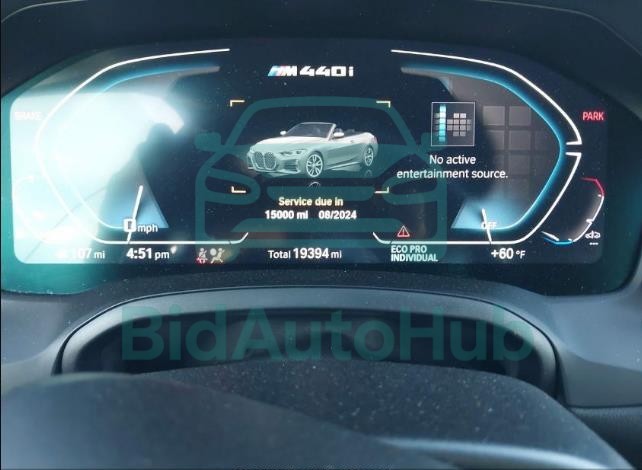 The BMW M440I 2022 - VIN: WBA63AT03NCH81203 is equipped with a 3.0l i-6 di, dohc, vvt, turbo, 382hp engine. This power unit is known for its efficiency and reliability, and it is part of modern generation of engines designed to balance performance with fuel economy. According to the auction data, the vehicle was registered with only 19394 miles of mileage at the time of sale.