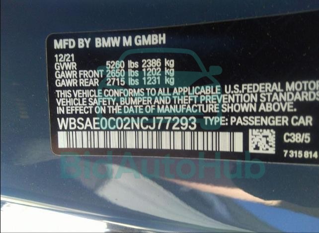 This BMW M8 2022 - VIN: WBSAE0C02NCJ77293 was originally purchased at one of the major insurance auctions in the United States or Canada. The vehicle history is tied directly to its VIN code, which makes it possible to track the origin, condition, and circumstances of the sale. The photographs provided represent the actual state of the car at the moment of auction and serve as an important visual record of its technical and cosmetic condition.