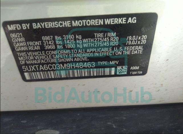 The BMW X5 2021 - VIN: 5UXTA6C03M9H48463 is equipped with a 3.0l dohc i-6 24v twinpower engine. This power unit is known for its efficiency and reliability, and it is part of modern generation of engines designed to balance performance with fuel economy. According to the auction data, the vehicle was registered with only Unknown of mileage at the time of sale.