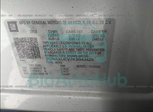 For a full understanding of the condition of this CHEVROLET EQUINOX 2019 - VIN: 3GNAXUEV7KS543425, it is strongly advised to analyze all available materials β€” both technical specifications and auction photographs. Such analysis provides the most objective picture of the car’s history, its advantages, and its potential defects.