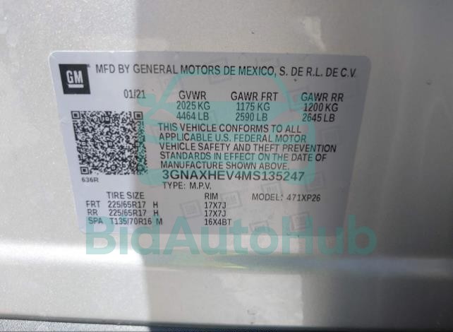 For a full understanding of the condition of this CHEVROLET EQUINOX 2021 - VIN: 3GNAXHEV4MS135247, it is strongly advised to analyze all available materials β both technical specifications and auction photographs. Such analysis provides the most objective picture of the carβs history, its advantages, and its potential defects.