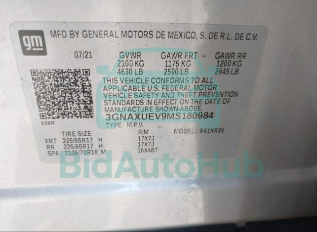 For a full understanding of the condition of this CHEVROLET EQUINOX 2021 - VIN: 3GNAXUEV9MS180984, it is strongly advised to analyze all available materials β both technical specifications and auction photographs. Such analysis provides the most objective picture of the carβs history, its advantages, and its potential defects.