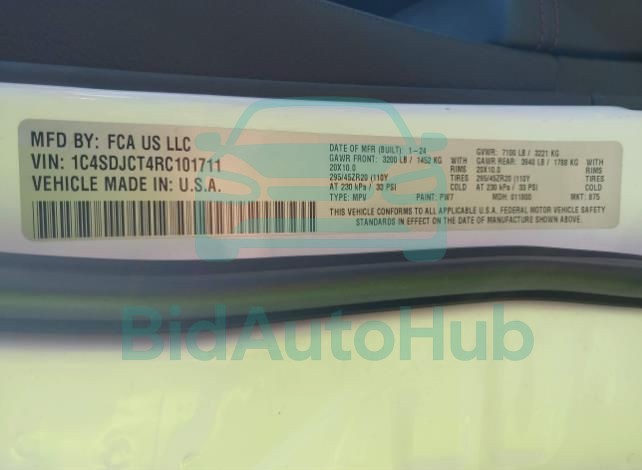 This DODGE DURANGO 2024 - VIN: 1C4SDJCT4RC101711 was originally purchased at one of the major insurance auctions in the United States or Canada. The vehicle history is tied directly to its VIN code, which makes it possible to track the origin, condition, and circumstances of the sale. The photographs provided represent the actual state of the car at the moment of auction and serve as an important visual record of its technical and cosmetic condition.
