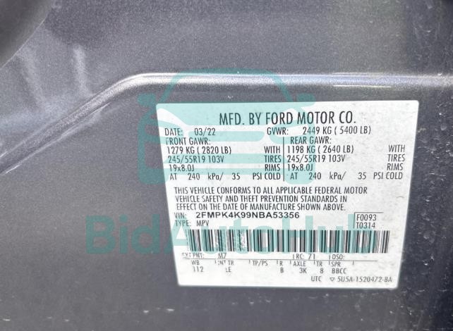 This FORD EDGE 2022 - VIN: 2FMPK4K99NBA53356 was originally purchased at one of the major insurance auctions in the United States or Canada. The vehicle history is tied directly to its VIN code, which makes it possible to track the origin, condition, and circumstances of the sale. The photographs provided represent the actual state of the car at the moment of auction and serve as an important visual record of its technical and cosmetic condition.