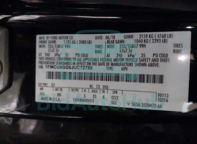 | VIN | 1FMCU9GD0JUC72780 |