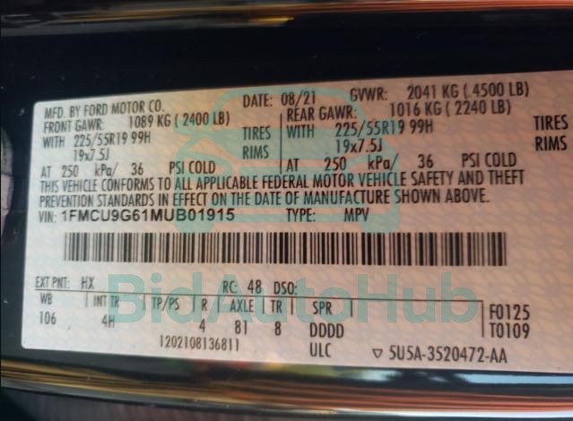 Each lot presented on our website includes comprehensive information tied to the VIN code. This allows users to cross-check vehicle data, verify the history of ownership, and confirm accident or insurance records. The FORD ESCAPE 2021 - VIN: 1FMCU9G61MUB01915 corresponds to a car that was listed through one of the large insurance auctions in USA, which guarantees traceability and transparency of the information.