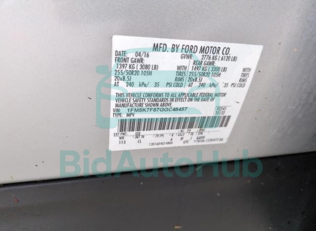 Each lot presented on our website includes comprehensive information tied to the VIN code. This allows users to cross-check vehicle data, verify the history of ownership, and confirm accident or insurance records. The FORD EXPLORER 2016 - VIN: 1FM5K7F87GGC48457 corresponds to a car that was listed through one of the large insurance auctions in USA, which guarantees traceability and transparency of the information.