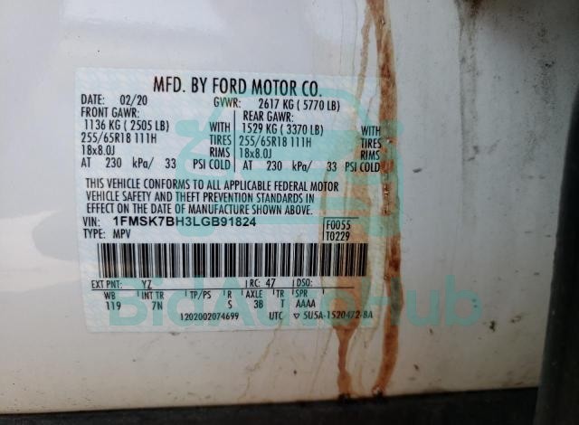 This FORD EXPLORER 2020 - VIN: 1FMSK7BH3LGB91824 was originally purchased at one of the major insurance auctions in the United States or Canada. The vehicle history is tied directly to its VIN code, which makes it possible to track the origin, condition, and circumstances of the sale. The photographs provided represent the actual state of the car at the moment of auction and serve as an important visual record of its technical and cosmetic condition.