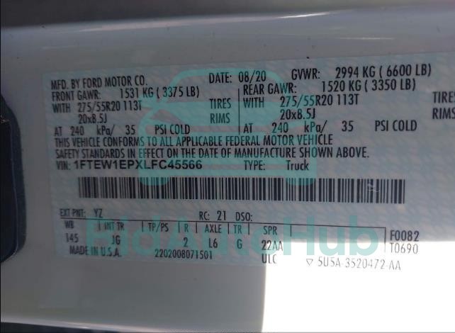 Each lot presented on our website includes comprehensive information tied to the VIN code. This allows users to cross-check vehicle data, verify the history of ownership, and confirm accident or insurance records. The FORD F-150 2020 - VIN: 1FTEW1EPXLFC45566 corresponds to a car that was listed through one of the large insurance auctions in USA, which guarantees traceability and transparency of the information.