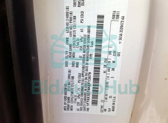 This FORD F-350 2019 - VIN: 1FT8X3DT4KEF13679 was originally purchased at one of the major insurance auctions in the United States or Canada. The vehicle history is tied directly to its VIN code, which makes it possible to track the origin, condition, and circumstances of the sale. The photographs provided represent the actual state of the car at the moment of auction and serve as an important visual record of its technical and cosmetic condition.