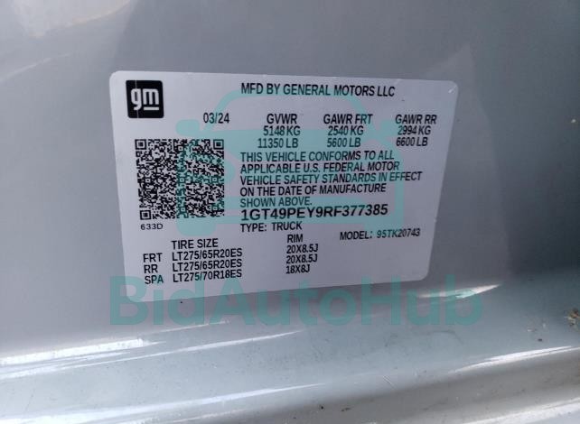 This GMC SIERRA 2024 - VIN: 1GT49PEY9RF377385 was originally purchased at one of the major insurance auctions in the United States or Canada. The vehicle history is tied directly to its VIN code, which makes it possible to track the origin, condition, and circumstances of the sale. The photographs provided represent the actual state of the car at the moment of auction and serve as an important visual record of its technical and cosmetic condition.
