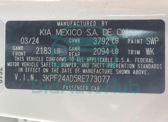 This KIA FORTE 2024 - VIN: 3KPF24AD5RE773077 was originally purchased at one of the major insurance auctions in the United States or Canada. The vehicle history is tied directly to its VIN code, which makes it possible to track the origin, condition, and circumstances of the sale. The photographs provided represent the actual state of the car at the moment of auction and serve as an important visual record of its technical and cosmetic condition.