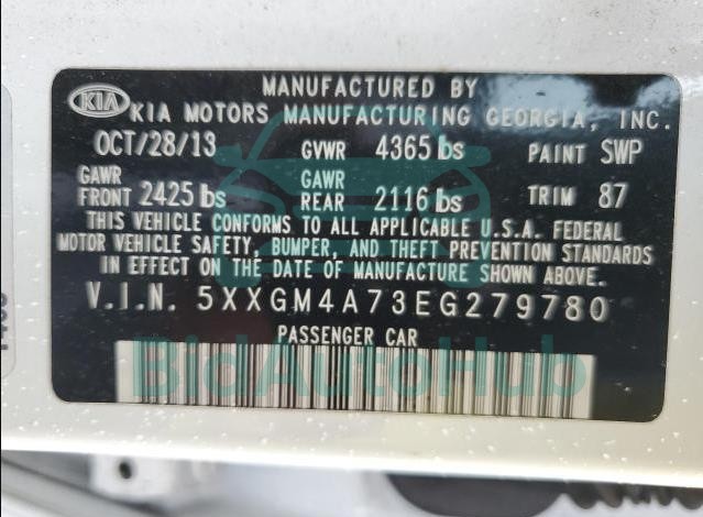 This KIA OPTIMA 2014 - VIN: 5XXGM4A73EG279780 was originally purchased at one of the major insurance auctions in the United States or Canada. The vehicle history is tied directly to its VIN code, which makes it possible to track the origin, condition, and circumstances of the sale. The photographs provided represent the actual state of the car at the moment of auction and serve as an important visual record of its technical and cosmetic condition.