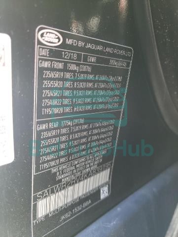 The LAND ROVER RANGEROVER 2019 - VIN: SALWR2RV4KA839195 is equipped with a 3.0l 6 engine. This power unit is known for its efficiency and reliability, and it is part of modern generation of engines designed to balance performance with fuel economy. According to the auction data, the vehicle was registered with only 60415 miles of mileage at the time of sale.