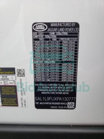 The LAND ROVER RANGEROVER 2023 - VIN: SAL1L9FUXPA130777 is equipped with a 3.0l 6 engine. This power unit is known for its efficiency and reliability, and it is part of modern generation of engines designed to balance performance with fuel economy. According to the auction data, the vehicle was registered with only of mileage at the time of sale.