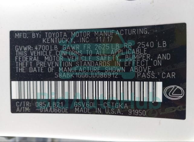 The LEXUS ES 350 2018 - VIN: 58ABK1GG6JU086912 is equipped with a 58ABK1GG6JU086912 engine. This power unit is known for its efficiency and reliability, and it is part of modern generation of engines designed to balance performance with fuel economy. According to the auction data, the vehicle was registered with only Automatic of mileage at the time of sale.
