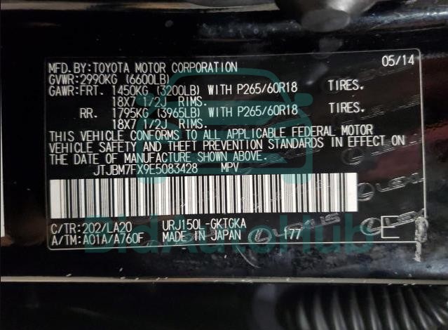| VIN | JTJBM7FX9E5083428 |