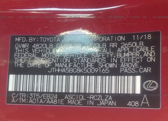 | VIN | JTHHA5BC8K5009165 |
