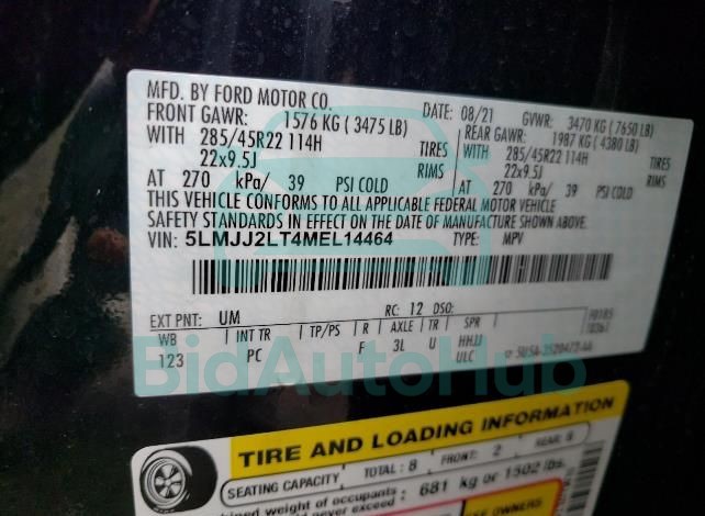 The LINCOLN NAVIGATOR 2021 - VIN: 5LMJJ2LT4MEL14464 is equipped with a 3.5l 6 engine. This power unit is known for its efficiency and reliability, and it is part of modern generation of engines designed to balance performance with fuel economy. According to the auction data, the vehicle was registered with only of mileage at the time of sale.