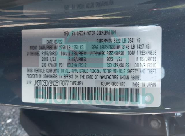 Each lot presented on our website includes comprehensive information tied to the VIN code. This allows users to cross-check vehicle data, verify the history of ownership, and confirm accident or insurance records. The MAZDA CX-9 2022 - VIN: JM3TCBDY8N0617077 corresponds to a car that was listed through one of the large insurance auctions in USA, which guarantees traceability and transparency of the information.