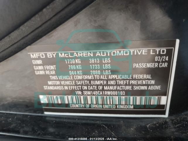 Each lot presented on our website includes comprehensive information tied to the VIN code. This allows users to cross-check vehicle data, verify the history of ownership, and confirm accident or insurance records. The MCLAREN 750S 2024 - VIN: SBM14BCA1RW008103 corresponds to a car that was listed through one of the large insurance auctions in USA, which guarantees traceability and transparency of the information.