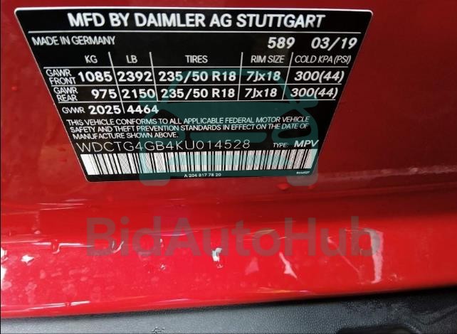 Each lot presented on our website includes comprehensive information tied to the VIN code. This allows users to cross-check vehicle data, verify the history of ownership, and confirm accident or insurance records. The MERCEDES-BENZ GLA-CLASS 2019 - VIN: WDCTG4GB4KU014528 corresponds to a car that was listed through one of the large insurance auctions in USA, which guarantees traceability and transparency of the information.
