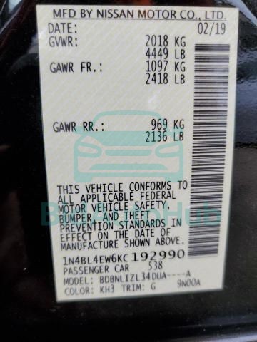 This NISSAN ALTIMA 2019 - VIN: 1N4BL4EW6KC192990 was originally purchased at one of the major insurance auctions in the United States or Canada. The vehicle history is tied directly to its VIN code, which makes it possible to track the origin, condition, and circumstances of the sale. The photographs provided represent the actual state of the car at the moment of auction and serve as an important visual record of its technical and cosmetic condition.