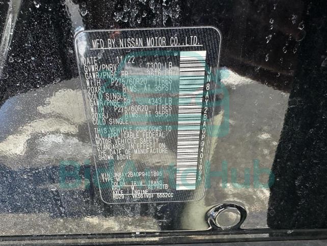 The NISSAN ARMADA 2023 - VIN: JN8AY2BA0P9401895 is equipped with a 5.6l 8 engine. This power unit is known for its efficiency and reliability, and it is part of modern generation of engines designed to balance performance with fuel economy. According to the auction data, the vehicle was registered with only 60906 miles of mileage at the time of sale.