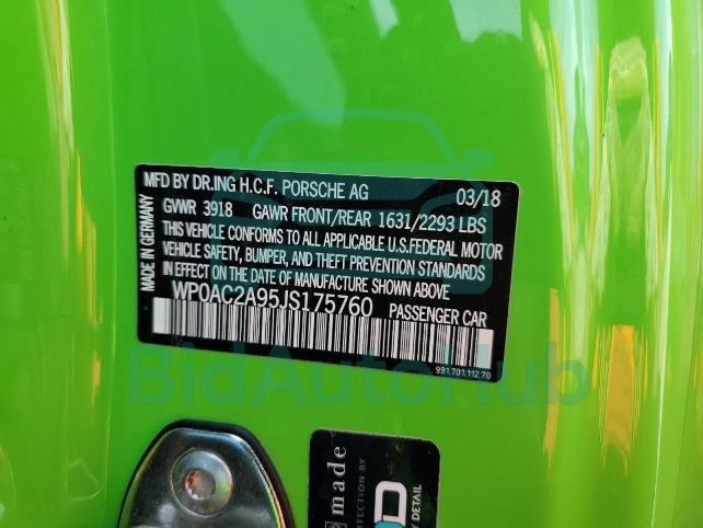 This PORSCHE 911 2018 - VIN: WP0AC2A95JS175760 was originally purchased at one of the major insurance auctions in the United States or Canada. The vehicle history is tied directly to its VIN code, which makes it possible to track the origin, condition, and circumstances of the sale. The photographs provided represent the actual state of the car at the moment of auction and serve as an important visual record of its technical and cosmetic condition.