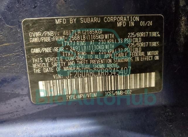 For a full understanding of the condition of this SUBARU CROSSTREK 2024 - VIN: JF2GUABCXR8345407, it is strongly advised to analyze all available materials β€” both technical specifications and auction photographs. Such analysis provides the most objective picture of the car’s history, its advantages, and its potential defects.