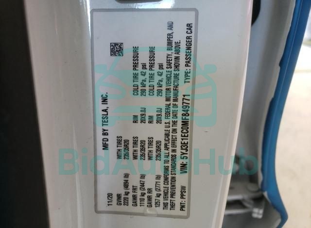 Each lot presented on our website includes comprehensive information tied to the VIN code. This allows users to cross-check vehicle data, verify the history of ownership, and confirm accident or insurance records. The TESLA MODEL 3 2021 - VIN: 5YJ3E1EC0MF849771 corresponds to a car that was listed through one of the large insurance auctions in USA, which guarantees traceability and transparency of the information.