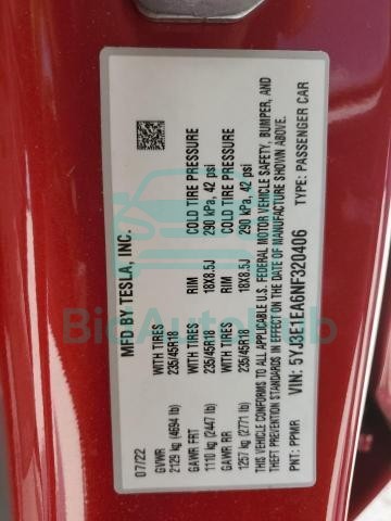 Each lot presented on our website includes comprehensive information tied to the VIN code. This allows users to cross-check vehicle data, verify the history of ownership, and confirm accident or insurance records. The TESLA MODEL 3 2022 - VIN: 5YJ3E1EA6NF320406 corresponds to a car that was listed through one of the large insurance auctions in USA, which guarantees traceability and transparency of the information.