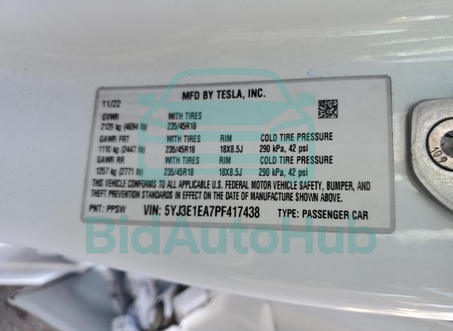 This TESLA MODEL 3 2023 - VIN: 5YJ3E1EA7PF417438 was originally purchased at one of the major insurance auctions in the United States or Canada. The vehicle history is tied directly to its VIN code, which makes it possible to track the origin, condition, and circumstances of the sale. The photographs provided represent the actual state of the car at the moment of auction and serve as an important visual record of its technical and cosmetic condition.