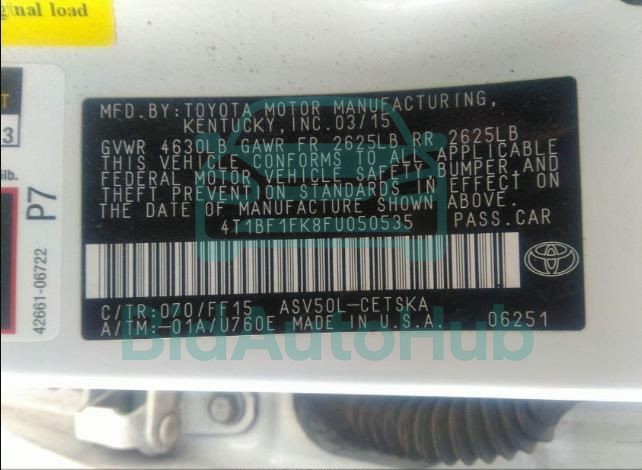For a full understanding of the condition of this TOYOTA CAMRY 2015 - VIN: 4T1BF1FK8FU050535, it is strongly advised to analyze all available materials β€” both technical specifications and auction photographs. Such analysis provides the most objective picture of the car’s history, its advantages, and its potential defects.