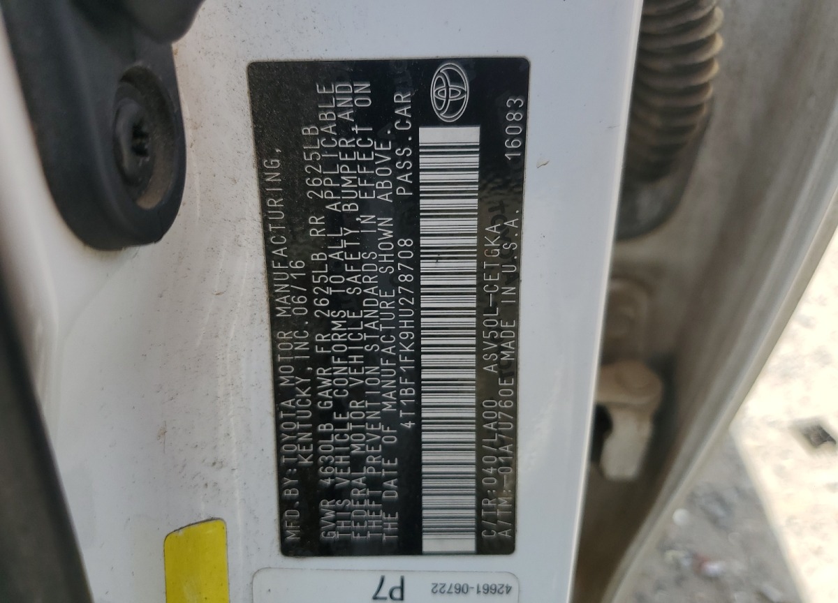 | VIN | 4T1BF1FK9HU278708 |