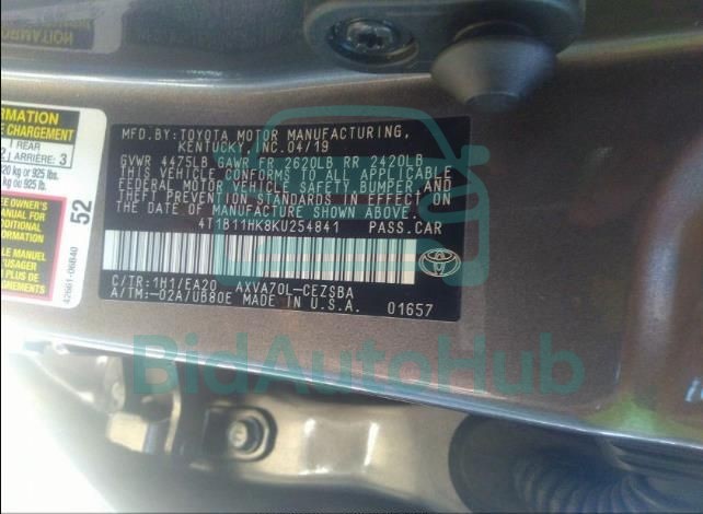 Each lot presented on our website includes comprehensive information tied to the VIN code. This allows users to cross-check vehicle data, verify the history of ownership, and confirm accident or insurance records. The TOYOTA CAMRY 2019 - VIN: 4T1B11HK8KU254841 corresponds to a car that was listed through one of the large insurance auctions in USA, which guarantees traceability and transparency of the information.