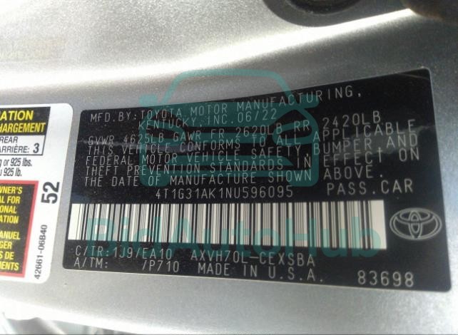 Each lot presented on our website includes comprehensive information tied to the VIN code. This allows users to cross-check vehicle data, verify the history of ownership, and confirm accident or insurance records. The TOYOTA CAMRY 2022 - VIN: 4T1G31AK1NU596095 corresponds to a car that was listed through one of the large insurance auctions in USA, which guarantees traceability and transparency of the information.