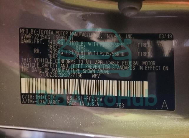 | VIN | 5TDDZ3DC9KS227166 |
