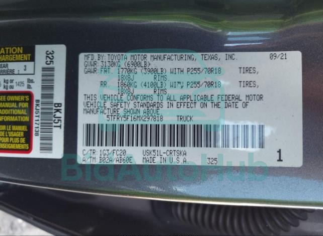 For a full understanding of the condition of this TOYOTA TUNDRA 2021 - VIN: 5TFRY5F16MX297818, it is strongly advised to analyze all available materials β both technical specifications and auction photographs. Such analysis provides the most objective picture of the carβs history, its advantages, and its potential defects.