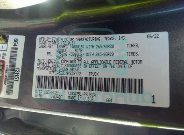 Each lot presented on our website includes comprehensive information tied to the VIN code. This allows users to cross-check vehicle data, verify the history of ownership, and confirm accident or insurance records. The TOYOTA TUNDRA 2022 - VIN: 5TFLA5DB1NX038712 corresponds to a car that was listed through one of the large insurance auctions in USA, which guarantees traceability and transparency of the information.